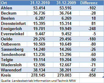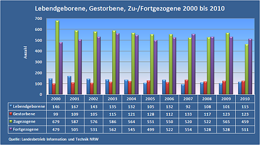 Verglichen mit den Zahlen des Jahres 2009 lebten Ende 2010 in Sendenhorst 60 Menschen weniger. Es sterben mehr als geboren werden und es ziehen mehr fort als zu. Das ist seit 2007 zu beobachten. Zwar werden in den letzten Jahren wieder mehr Kinder geboren als im Jahr 2007, das Jahr mit der niedrigsten Geburtenzahl, die Sterbefälle überwiegen jedoch weiterhin.