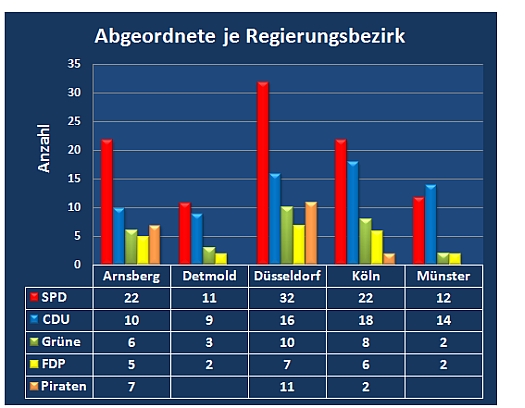 Bei den Landtagswahlen am 13.5.2012 hat die SPD 99 von 128 Wahlbezirken gewonnen. Dies - noch vorläufige -Wahlergebnis führt dazu, das der Landtag statt der regulären 181 Sitze nun 237 hat.